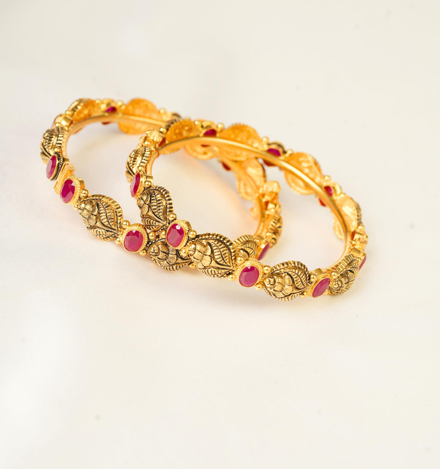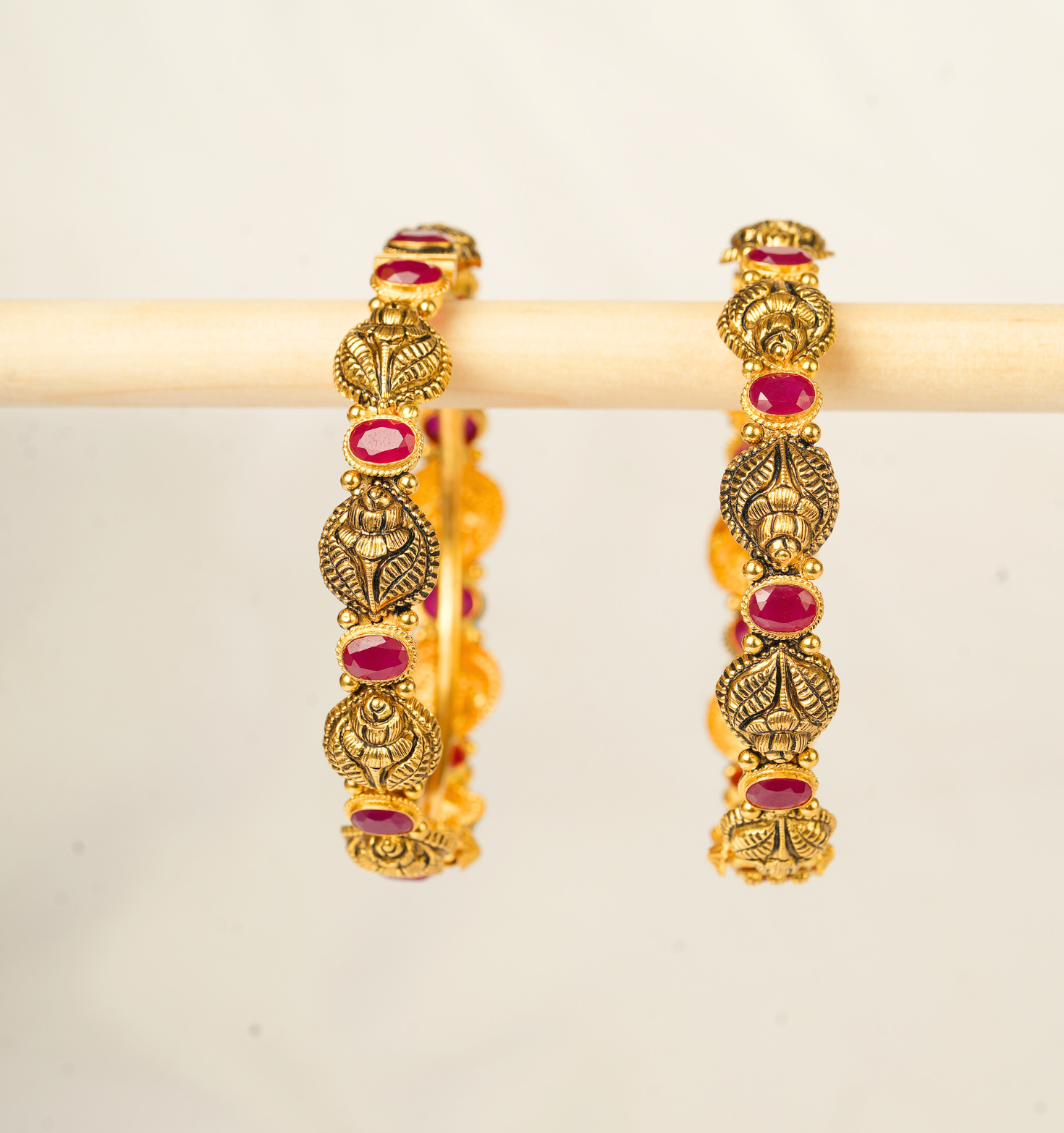 These Antique Bangles, weighing 44.320 grams and crafted in 22Kt pure gold, showcase intricate detailing inspired by heritage South Indian artistry — a perfect addition to your bridal or festive collection.