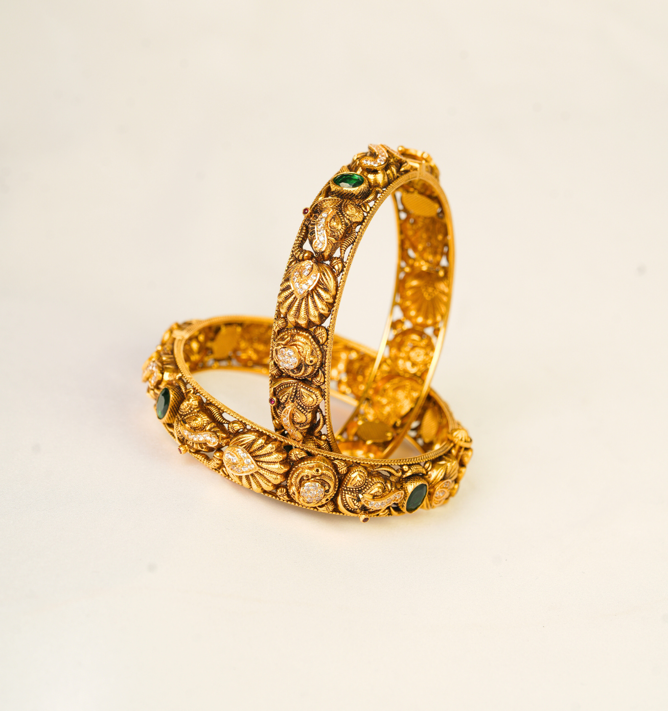 Timeless elegance meets heritage design in these intricately crafted antique bangles. Made with pure 22Kt gold, this 54.300-gram masterpiece reflects traditional artistry, perfect for weddings, heirloom collections, and grand occasions — exclusively at Sri Swarnambigai Jewellers.