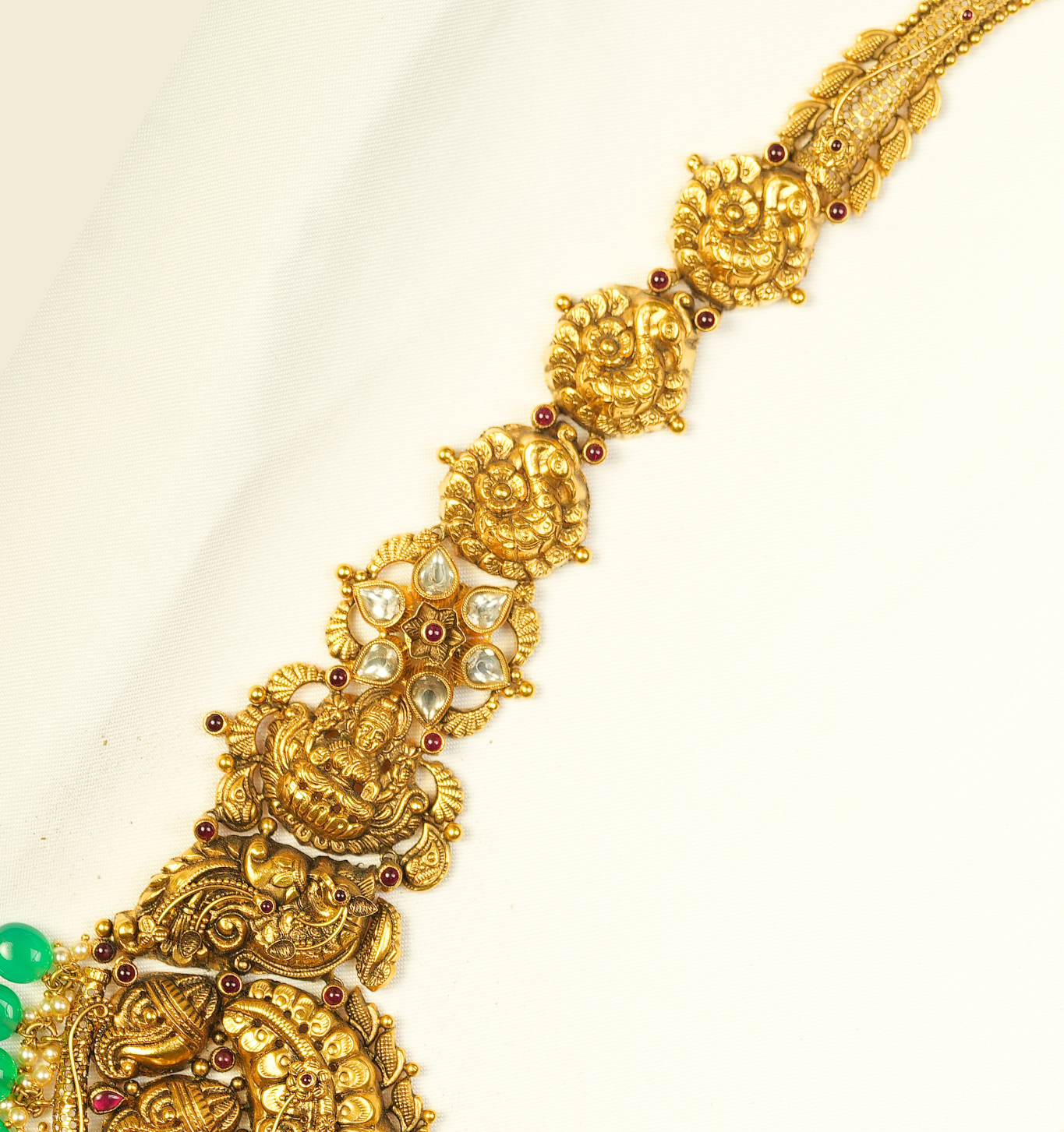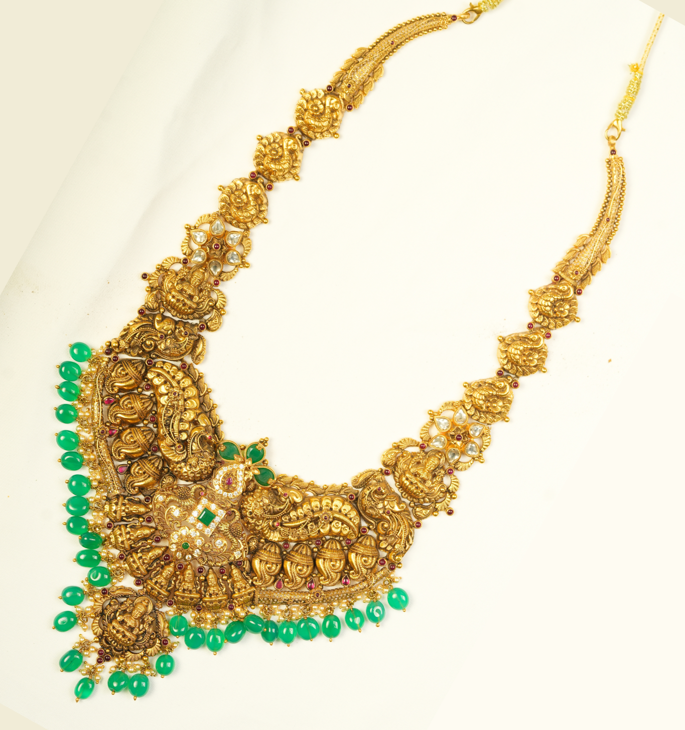An exquisite masterpiece crafted in pure 22Kt gold, this antique haram reflects timeless tradition and regal elegance. Intricately detailed with heritage motifs, it’s a perfect adornment for grand occasions. A true symbol of legacy, exclusively at Sri Swarnambigai Jewellers.
