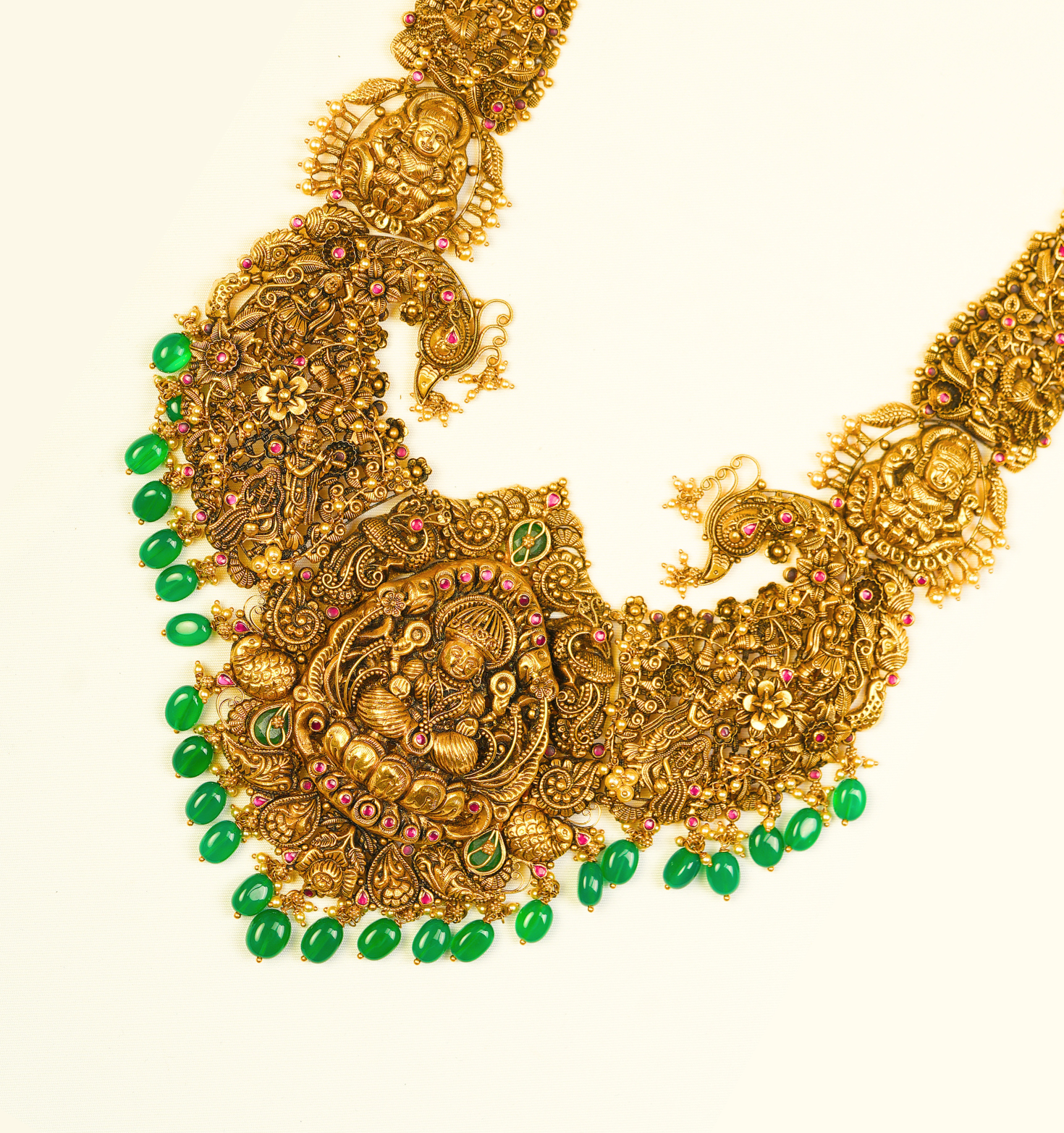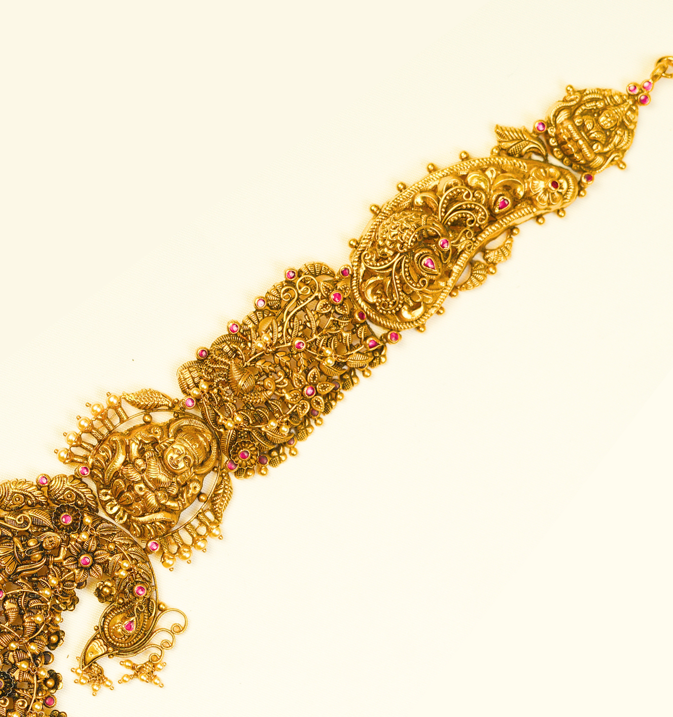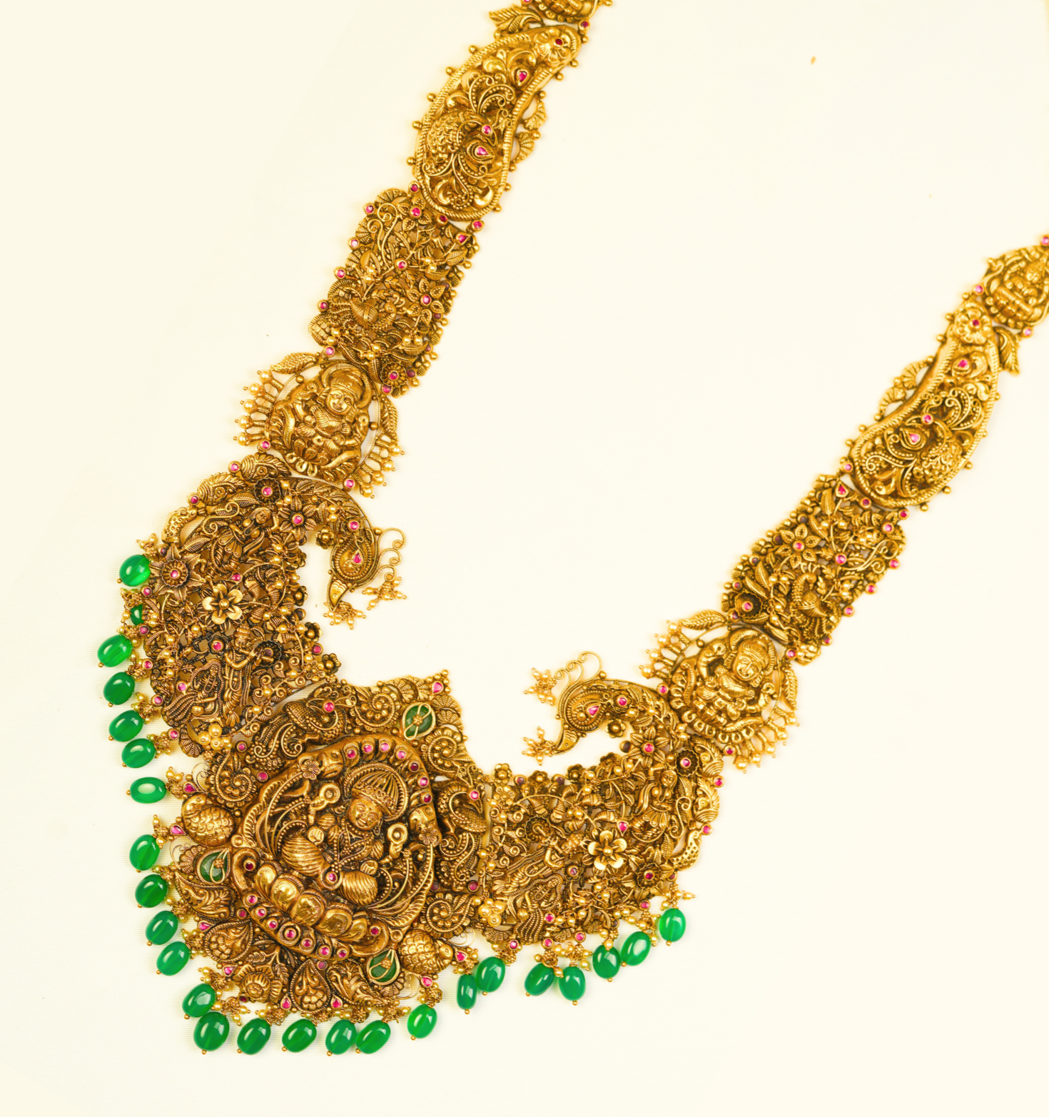 An exquisite heritage piece crafted in pure 22Kt gold, this Antique Haram weighs an impressive 156.070 grams. Rich in traditional artistry and majestic in presence, it reflects timeless elegance and royal charm — a treasured addition for grand occasions. Own the legacy, only at Sri Swarnambigai Jewellers.
