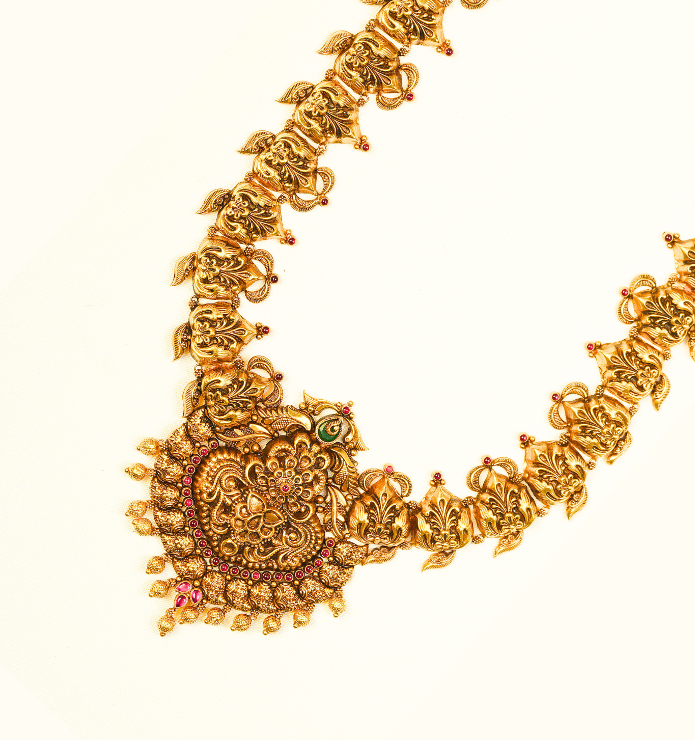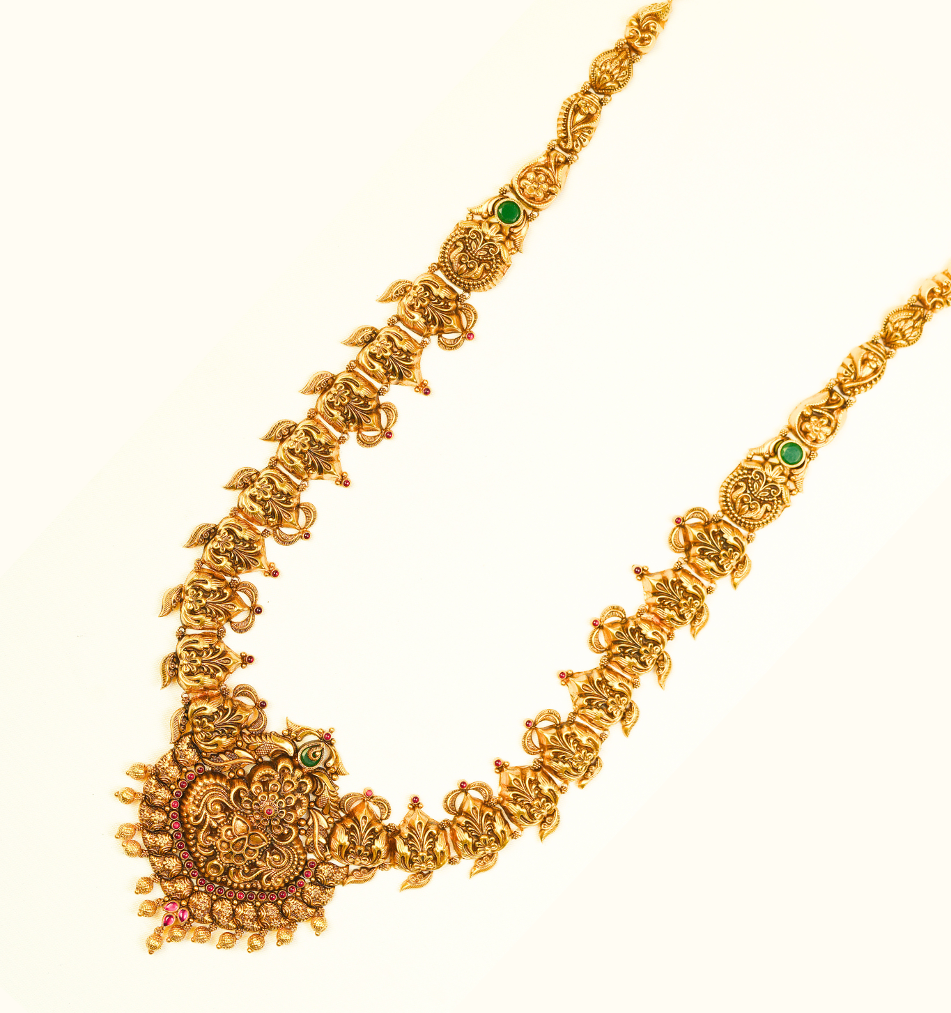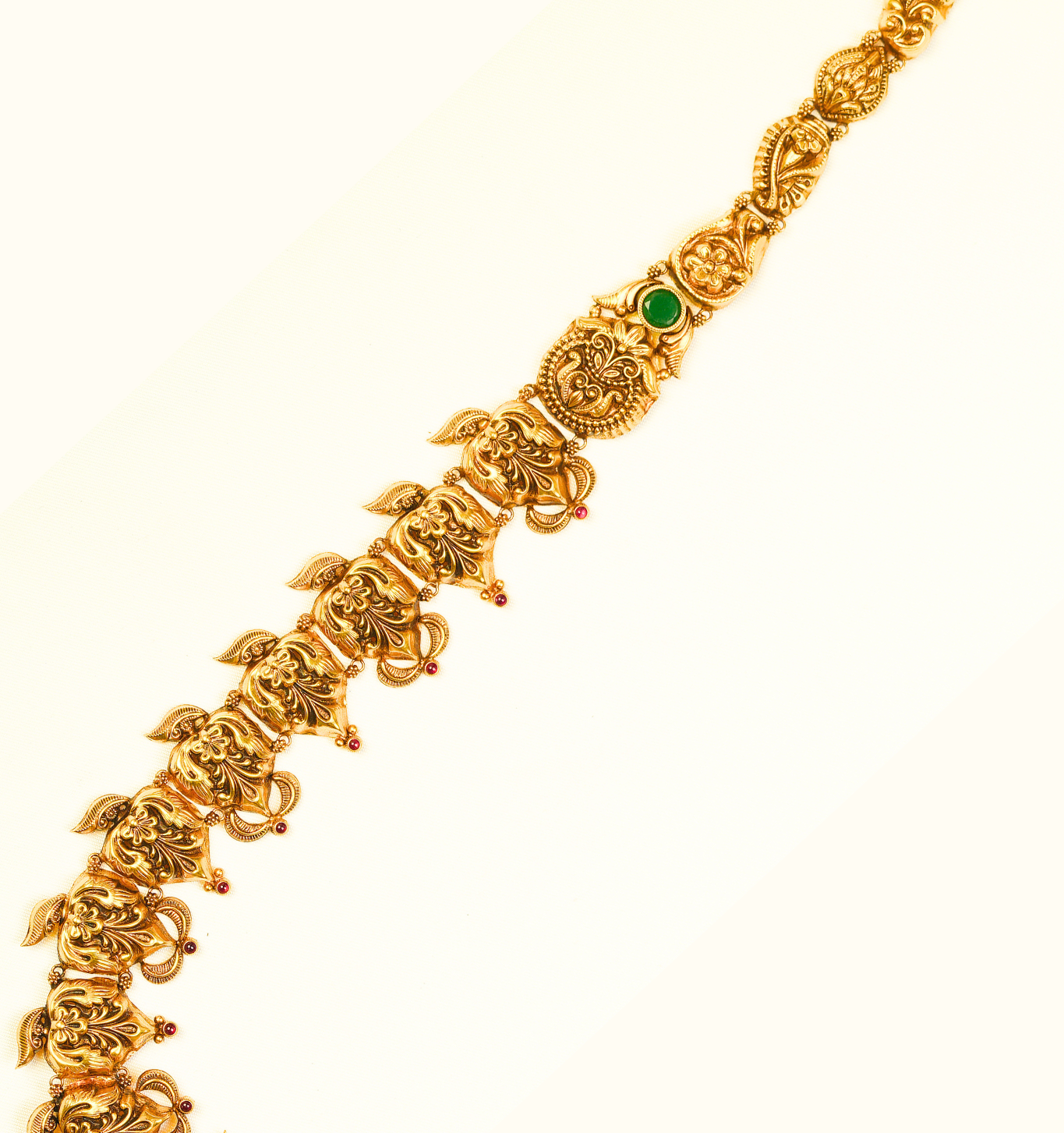 Experience timeless elegance with our handcrafted Antique Haram, intricately designed in 22Kt gold. Weighing 47.220 grams, this masterpiece reflects heritage charm and regal craftsmanship — exclusively at Sri Swarnambigai Jewellers.