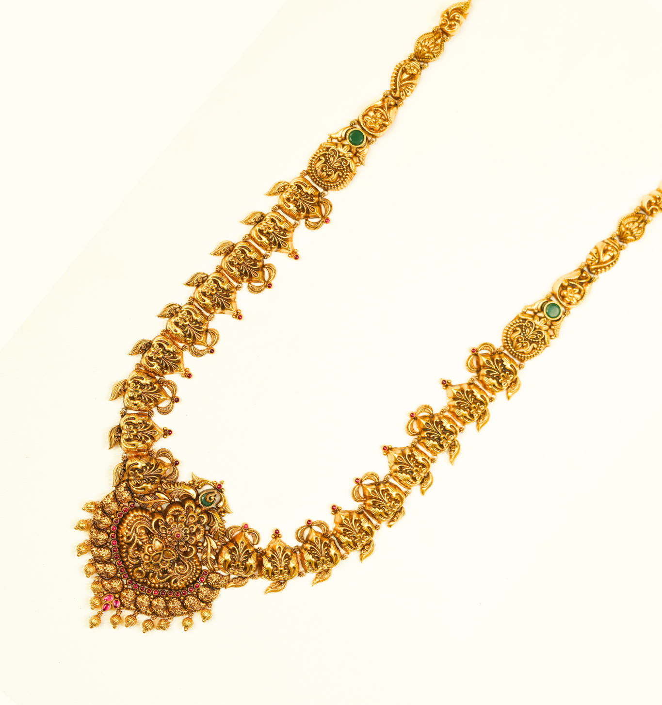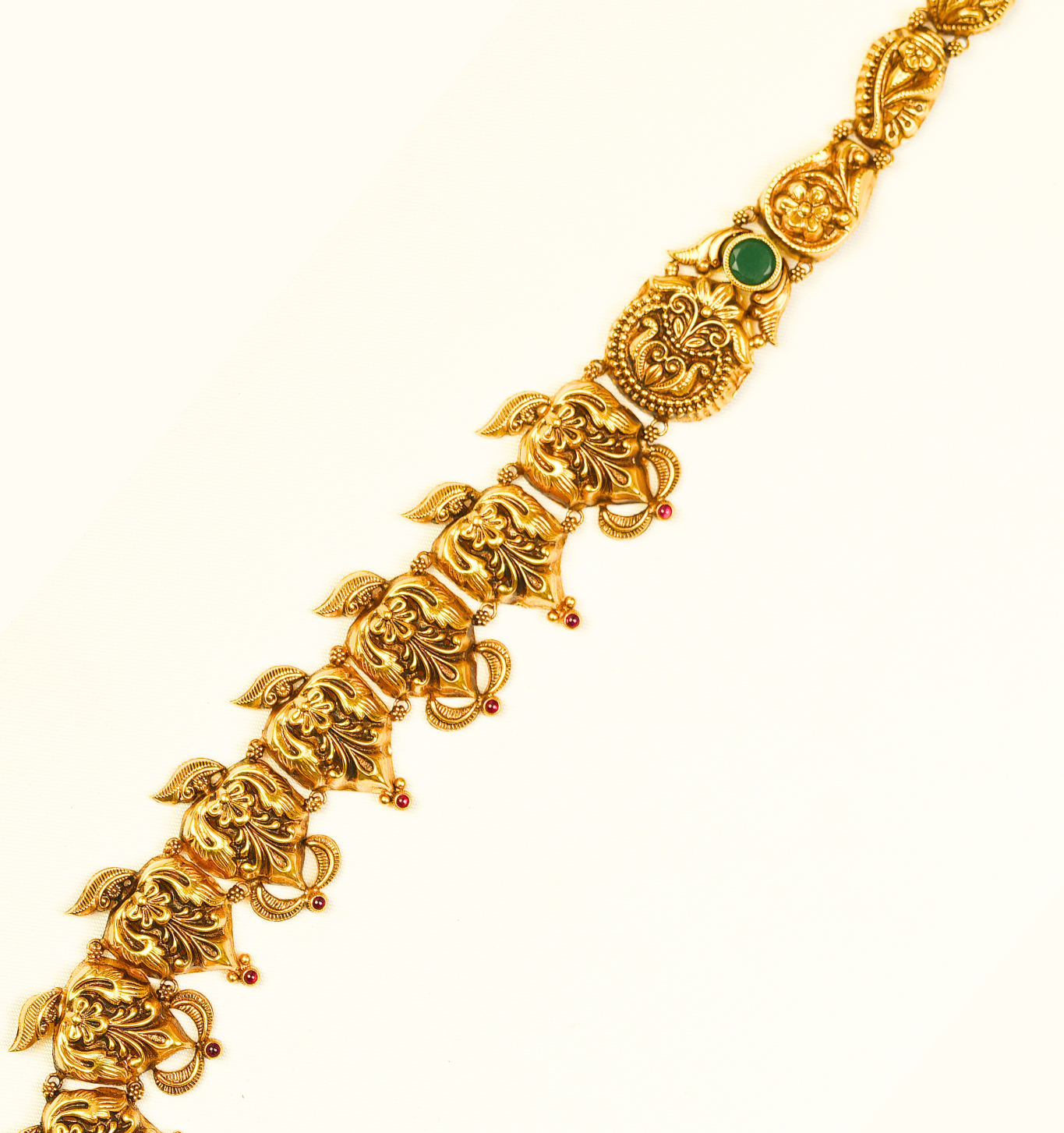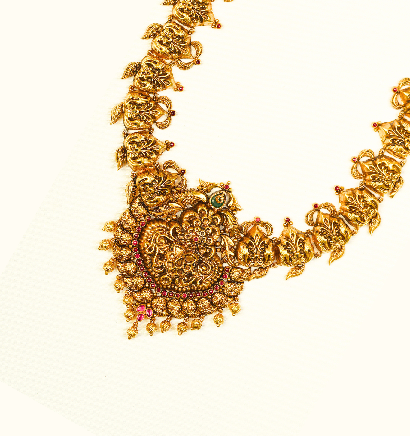 An exquisite blend of heritage and elegance, this handcrafted Antique Haram radiates traditional charm with intricate detailing. Perfect for weddings and grand occasions — a timeless treasure from Sri Swarnambigai Jewellers.