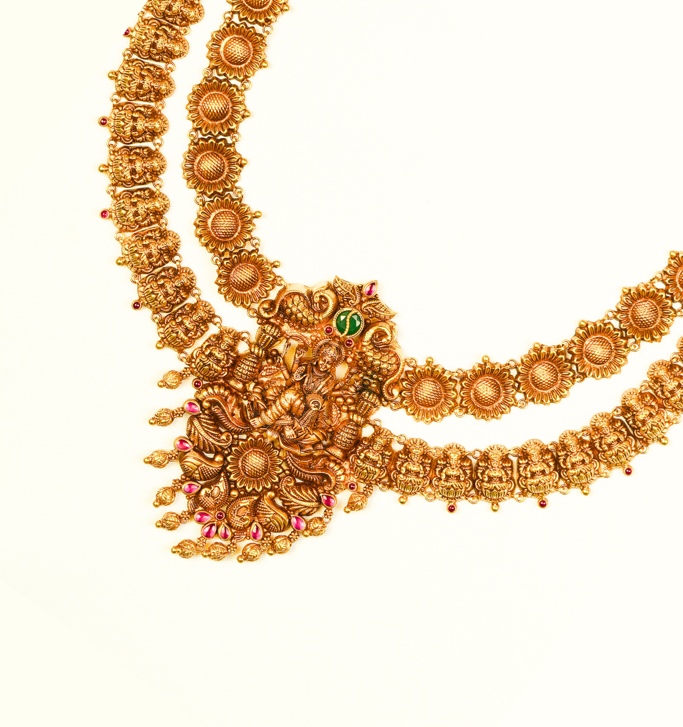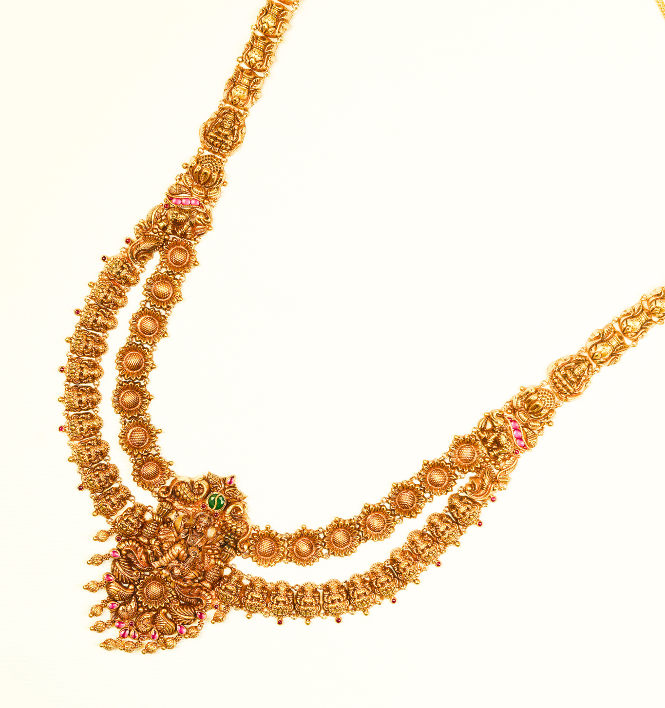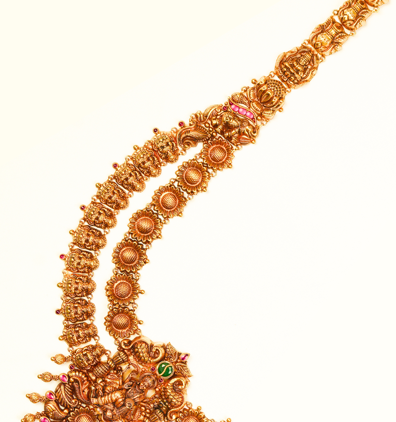 Experience timeless grandeur with this majestic Antique Harram, expertly handcrafted in 22Kt pure gold and weighing 54.110 grams. Showcasing traditional artistry and intricate detailing, this heirloom-worthy piece is a perfect blend of heritage and elegance. A royal treasure — exclusively at Sri Swarnambigai Jewellers.