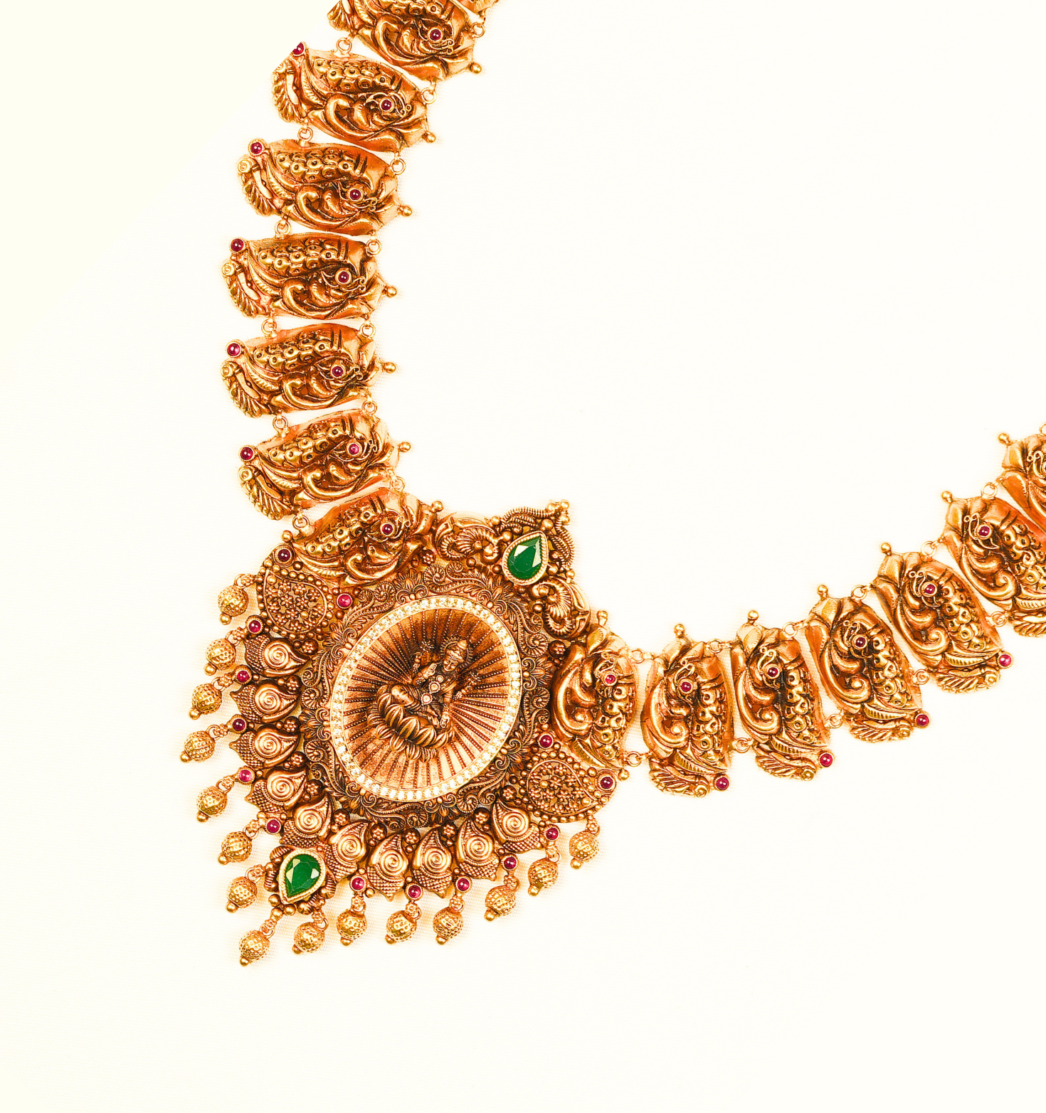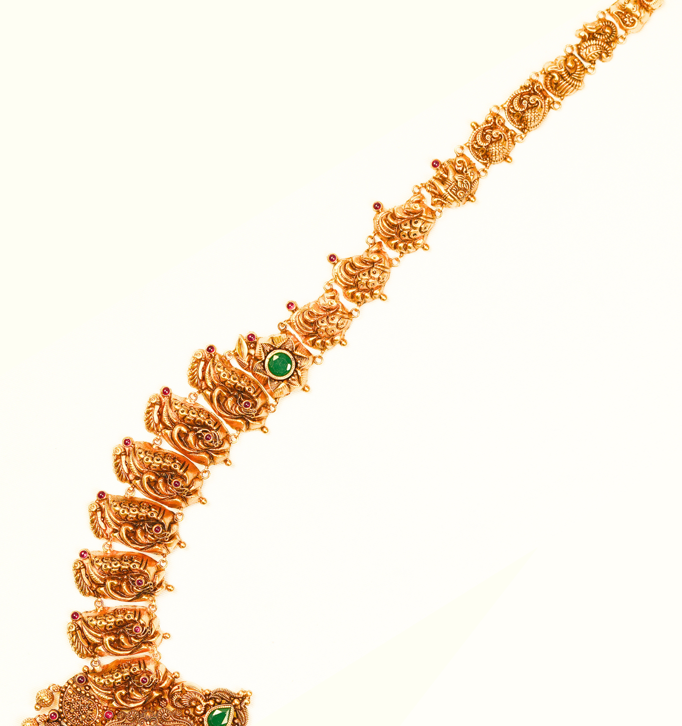 A regal creation in pure 22Kt gold, this 56.190-gram Antique Haram showcases timeless craftsmanship and intricate detailing. Perfect for bridal elegance or grand occasions, it brings heritage and grace together in one majestic piece. Own a legacy — only at Sri Swarnambigai Jewellers.