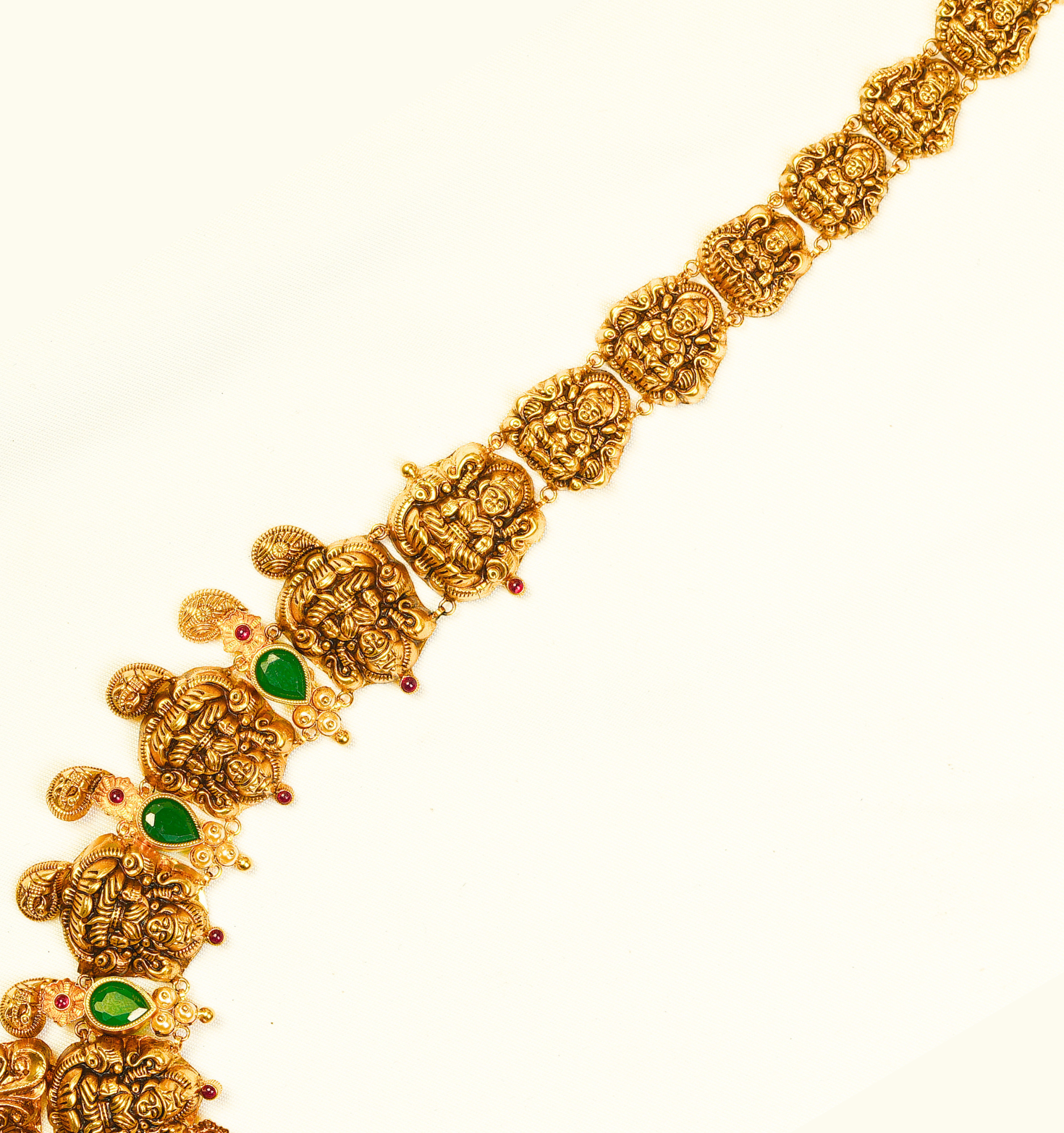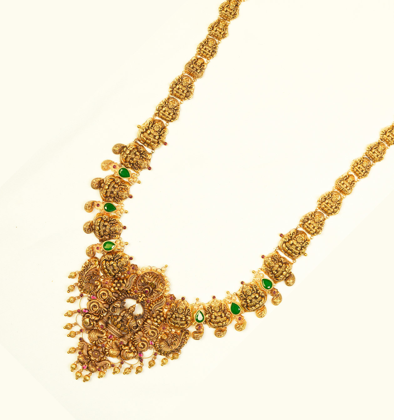 An epitome of grandeur and heritage, this Antique Haram is masterfully crafted in pure 22Kt gold, weighing 64.370 grams. Featuring intricate traditional motifs and timeless antique finish, it’s the perfect choice for brides and grand occasions. Own a legacy of elegance — only at Sri Swarnambigai Jewellers.