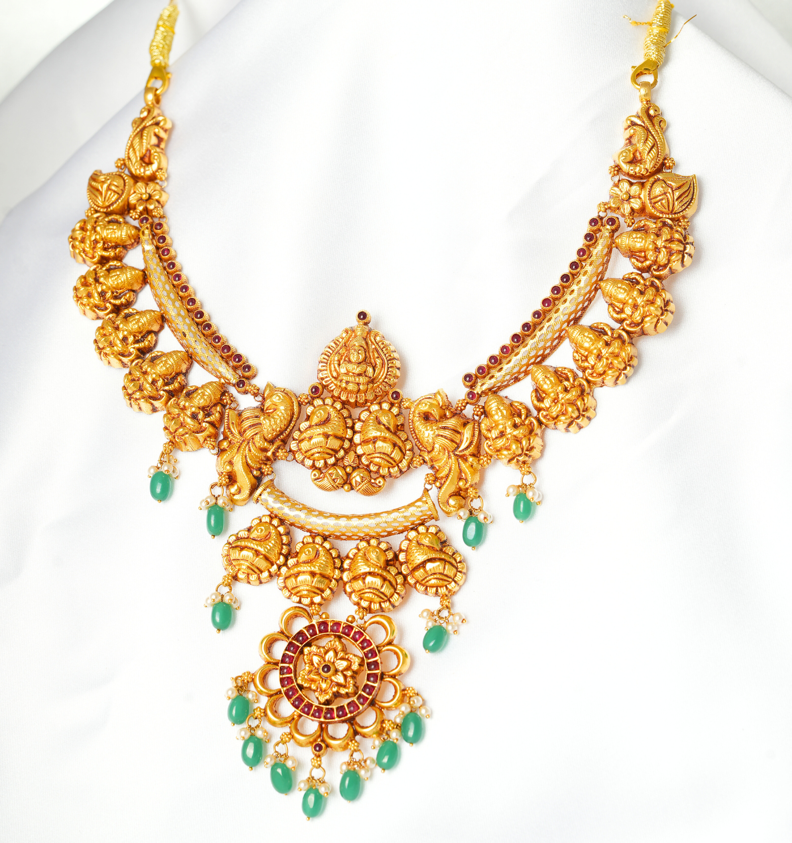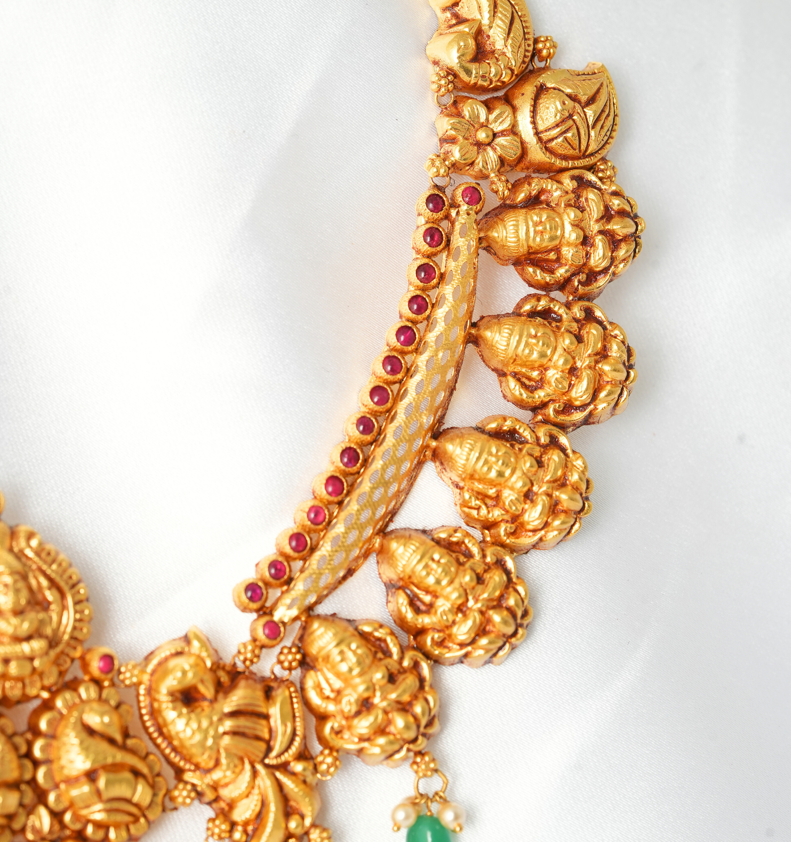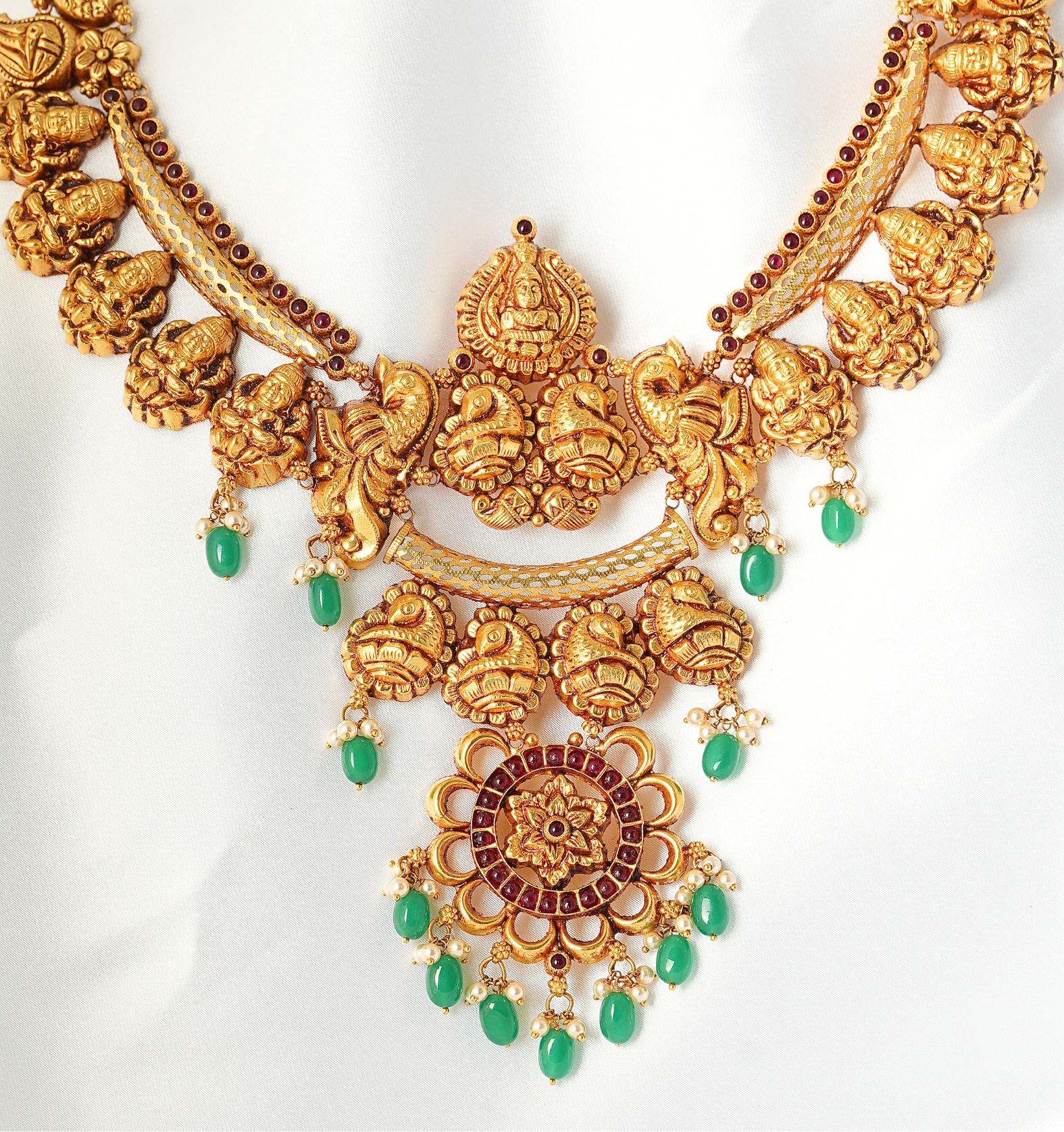 Experience timeless elegance with this handcrafted antique necklace from Sri Swarnambigai Jewellers. Made from pure 22-karat gold, this 39.310-gram masterpiece features intricate traditional detailing, perfect for bridal wear or special occasions. The vintage finish adds charm, while its craftsmanship reflects our legacy of over four decades in fine jewellery.
