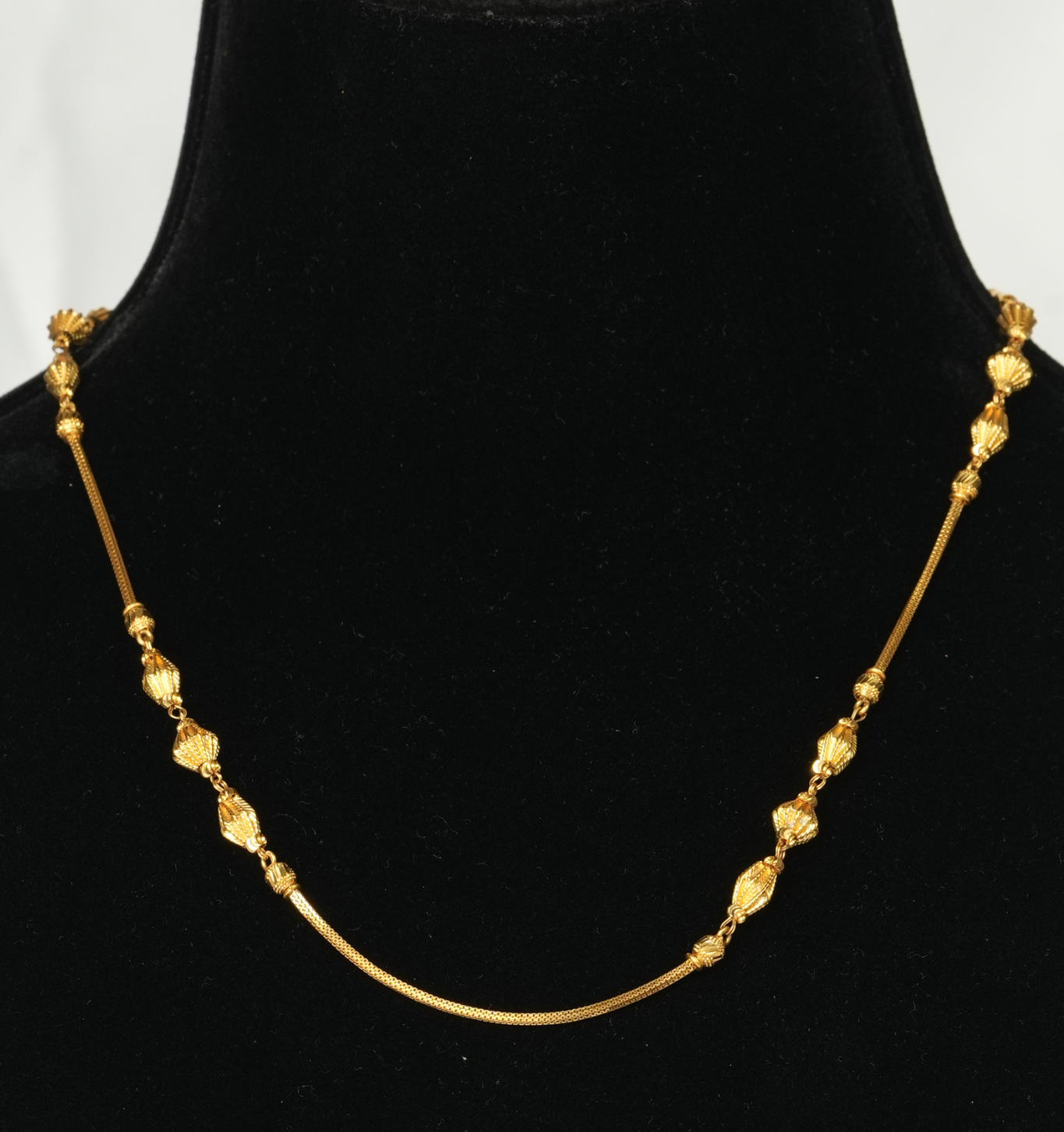 Crafted in pure 22Kt gold and weighing 10.530 grams, this elegant chain is a perfect blend of simplicity and style. Designed for everyday wear or special occasions, it adds a subtle yet refined touch to your look. A classic piece of timeless beauty — only at Sri Swarnambigai Jewellers.