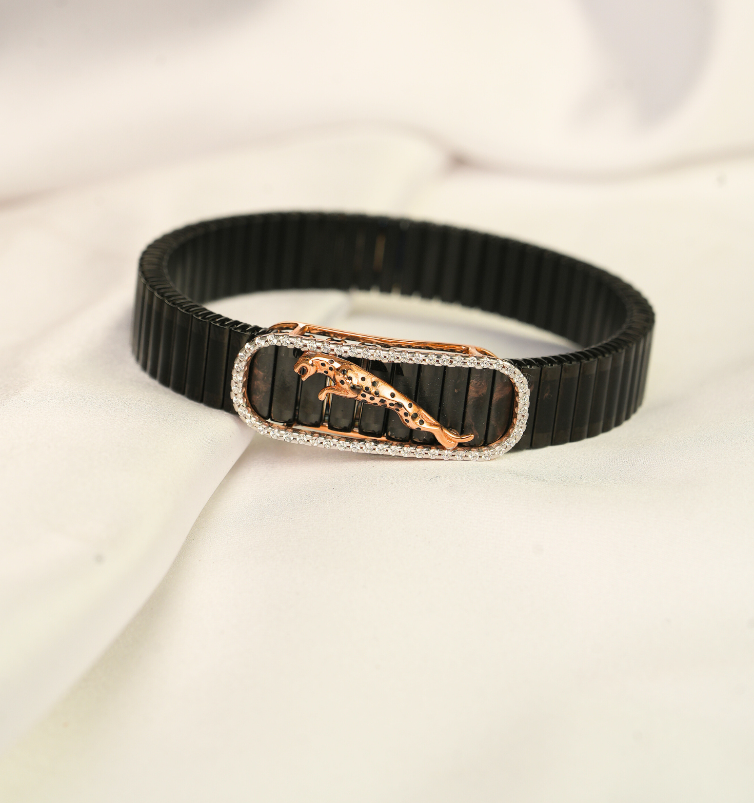 Bold in style and fierce in design, this Gents Jaguar Spring Kada is crafted in 18Kt gold and weighs 4.331 grams. Featuring a dynamic jaguar motif and a spring mechanism for easy wear, it’s the perfect blend of masculinity and modern elegance. A powerful statement piece — only at Sri Swarnambigai Jewellers.