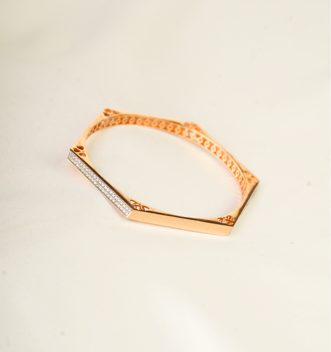A stunning blend of modern design and classic elegance, these Hexagon Stone Bangles are crafted in 18Kt gold and weigh 26.070 grams. Embellished with radiant stones in a unique hexagonal pattern, they bring a bold and contemporary flair to your jewellery collection. Shine with sophistication — only at Sri Swarnambigai Jewellers.