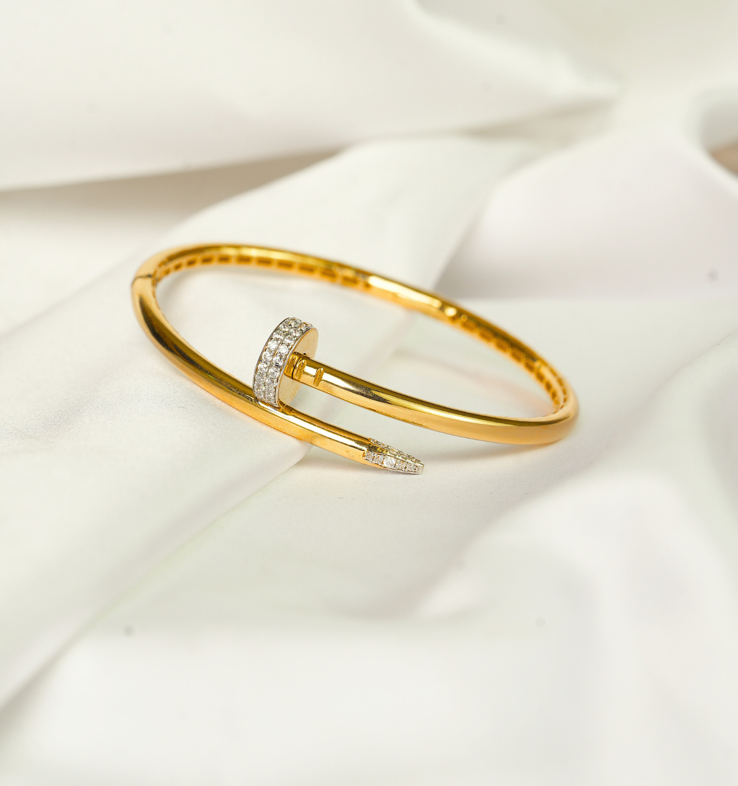Bold, modern, and elegant — this Tiffany Kada is crafted in 18Kt gold and weighs 15.270 grams. Designed to make a statement, its sleek finish and contemporary style make it the perfect accessory for both traditional and western outfits. Redefine your style — only at Sri Swarnambigai Jewellers.