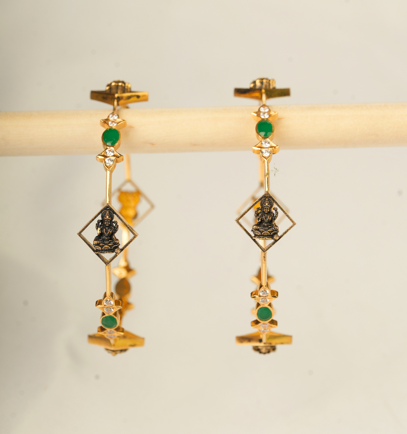 Grace your wrists with regal charm. These Stone Antique Bangles, crafted in pure 22Kt gold and weighing 38.870 grams, showcase a perfect fusion of traditional artistry and vibrant gemstone detailing. A timeless statement of heritage and elegance — only at Sri Swarnambigai Jewellers.